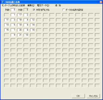 | モンタージュは、配置の行と列数、その位置とデータ番号の関係、データ番号とデータ名称の関係、外形を円にするかどうかを記録します。 マトリックスグラフやトポグラフを描くための配置設定に使用しますが、各種の表示や解析のデータ番号設定にも使用します。 列、行数ともに1~15です。 外形を円にするとトポグラフが円になり4端の不要なデータはブランクになります。 モンタージュはファイルとして記録や呼出しができ各データで共用できます。 |